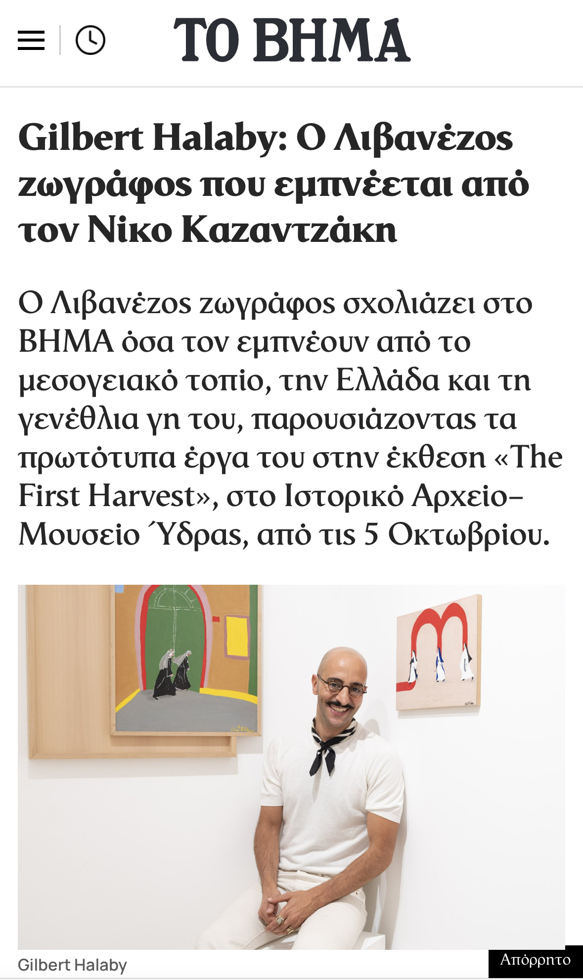 TO BHMA Link Articolo: , https://www.tovima.gr/2024/10/02/culture/gilbert-halaby-o-livanezos-zografos-pou-empneetai-apo-ton-niko-kazantzaki/, EXIBART Sonnet VJune 10, 2025Read MoreINSIDEART Sonnet VJune 10, 2025Read MoreAIR MAIL – Roman HalabyMay 8, 2025Read More
